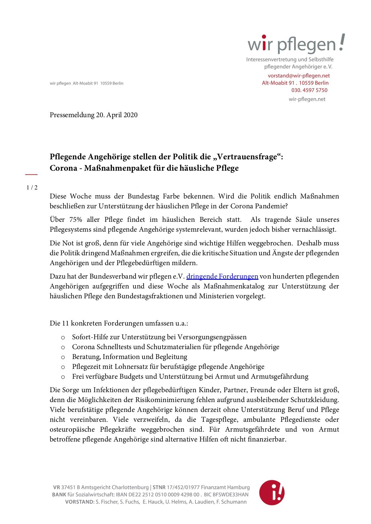 Pflegende Angehörige stellen der Politik die „Vertrauensfrage“ – PM 20.04.2020