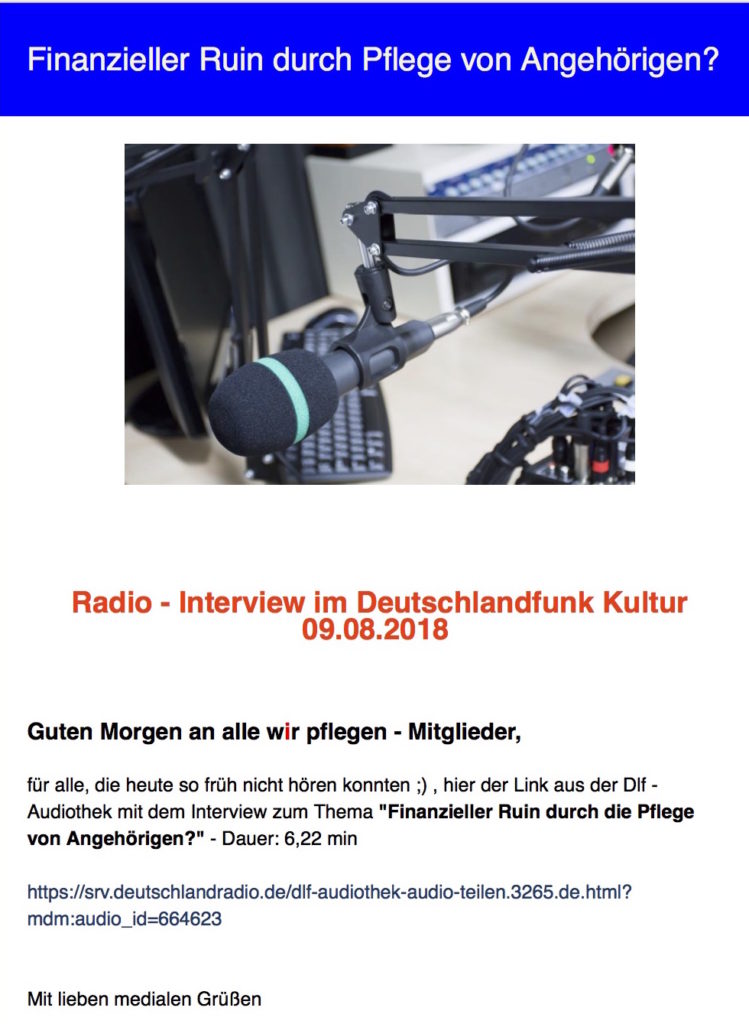 Dieses Schreiben an unsere Mitglieder von wir pflegen e.V. teilen wir auch gerne hier! Den Link zur Mediathek des Deutschlandfunk-Kultur-Radios finden Sie hier!